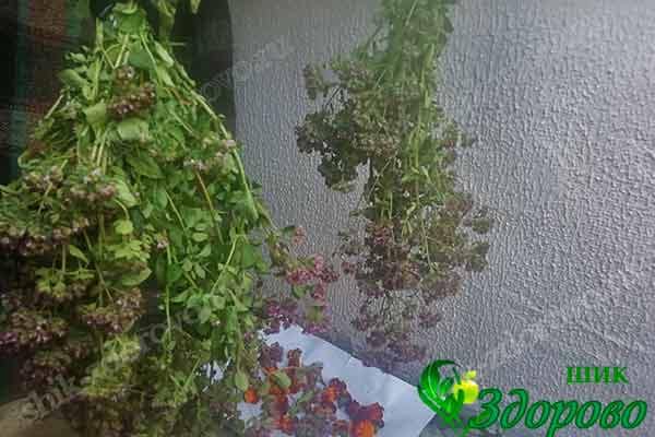 Сушат тут же после сбора на открытом воздухе в затененном месте, разложив тонким слоем или подвесив небольшими рыхлыми пучками примерно по 10 веточек. Также можно сушить в приоткрытой духовке при температуре до 45°С. Сушить следует до ломкости стеблей с характерным хрустом.