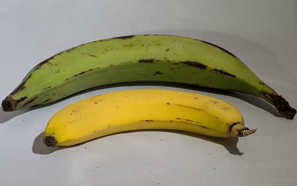 Плантаны отличаются крупными размерами, меньше изогнуты, с более выраженными продольными ребрами. Кожура у них более плотная, при созревании темнеет. В плантанах содержится крахмал, из-за чего вкус несколько мучнистый. Но при правильном хранении крахмал переходит в сахар, и они становятся более сладкими.